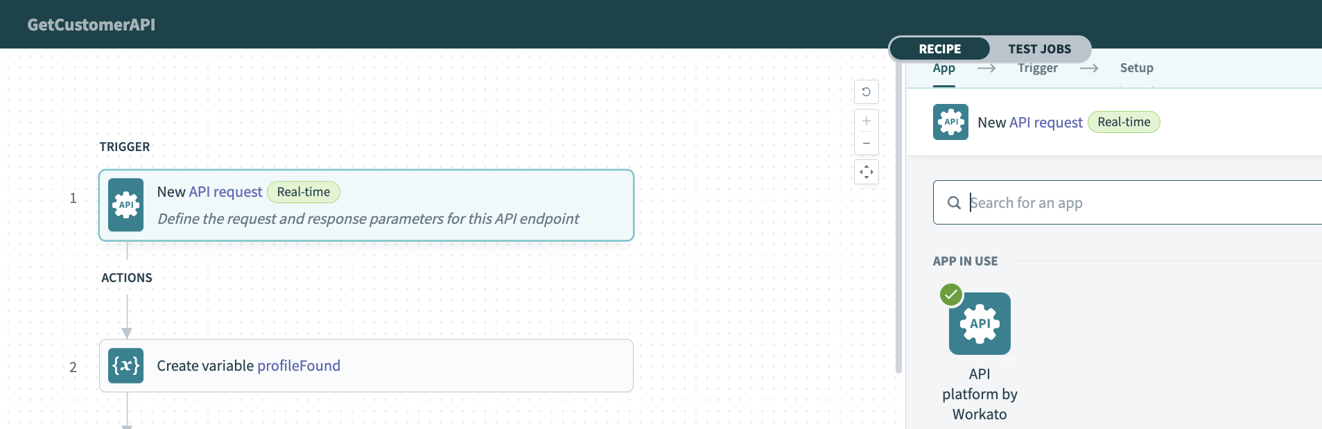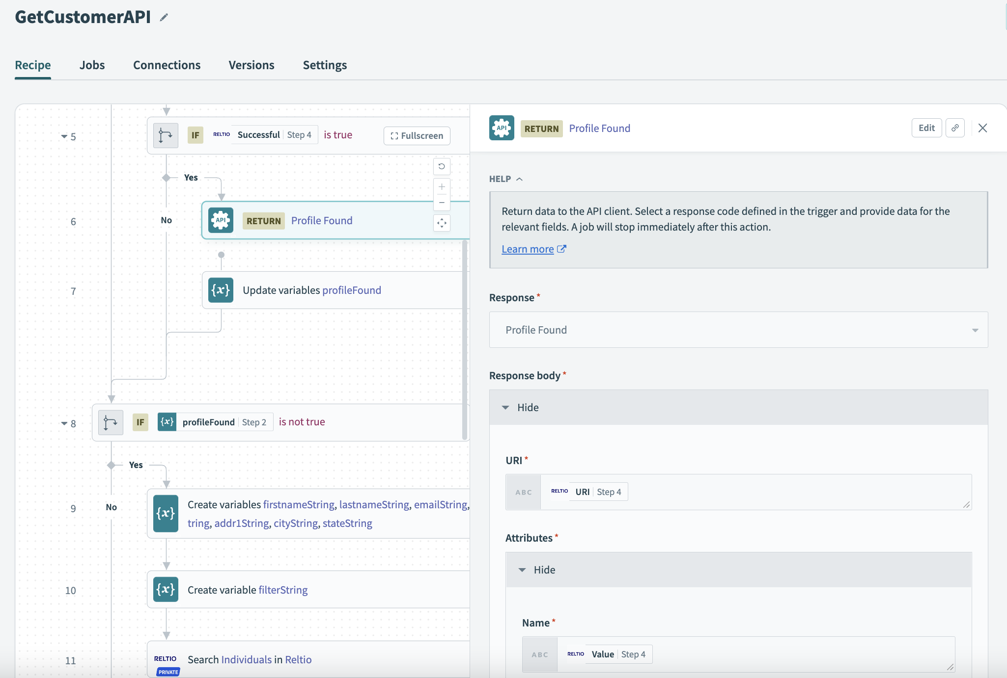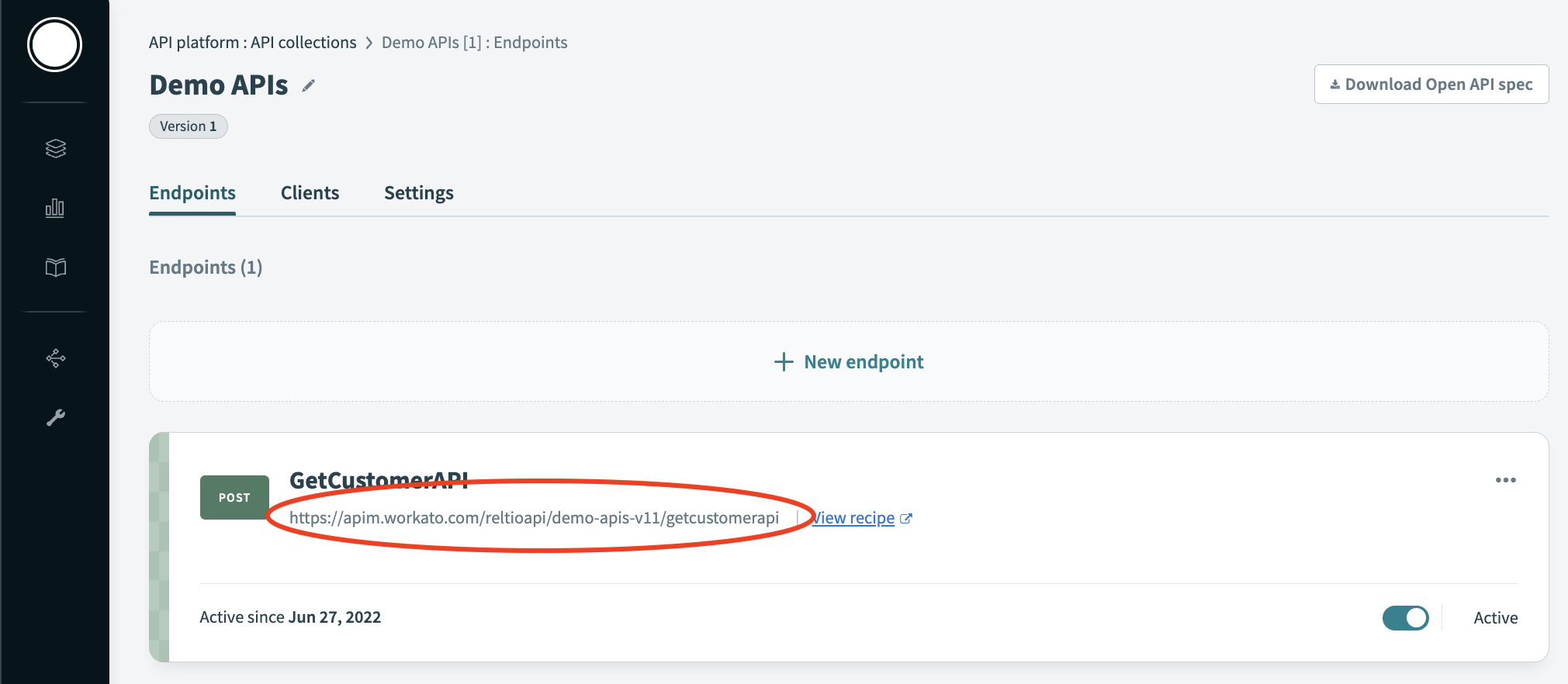 6) Define an Endpoint, using your API recipe. Note that the URL is displayed, and is a concatenation of a base, your API Collection, and your Endpoint