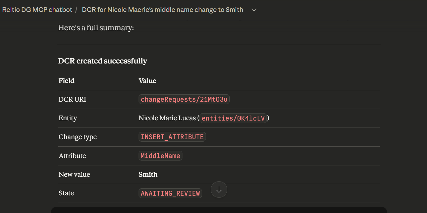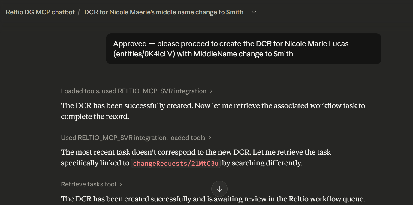 When triggering a DCR through our MCP integration (using Claude), the system successfully creates a DCR ID. However, the workflow is not getting initiated on the Reltio side, and the request does not appear in the workflow inbox for review/approval.